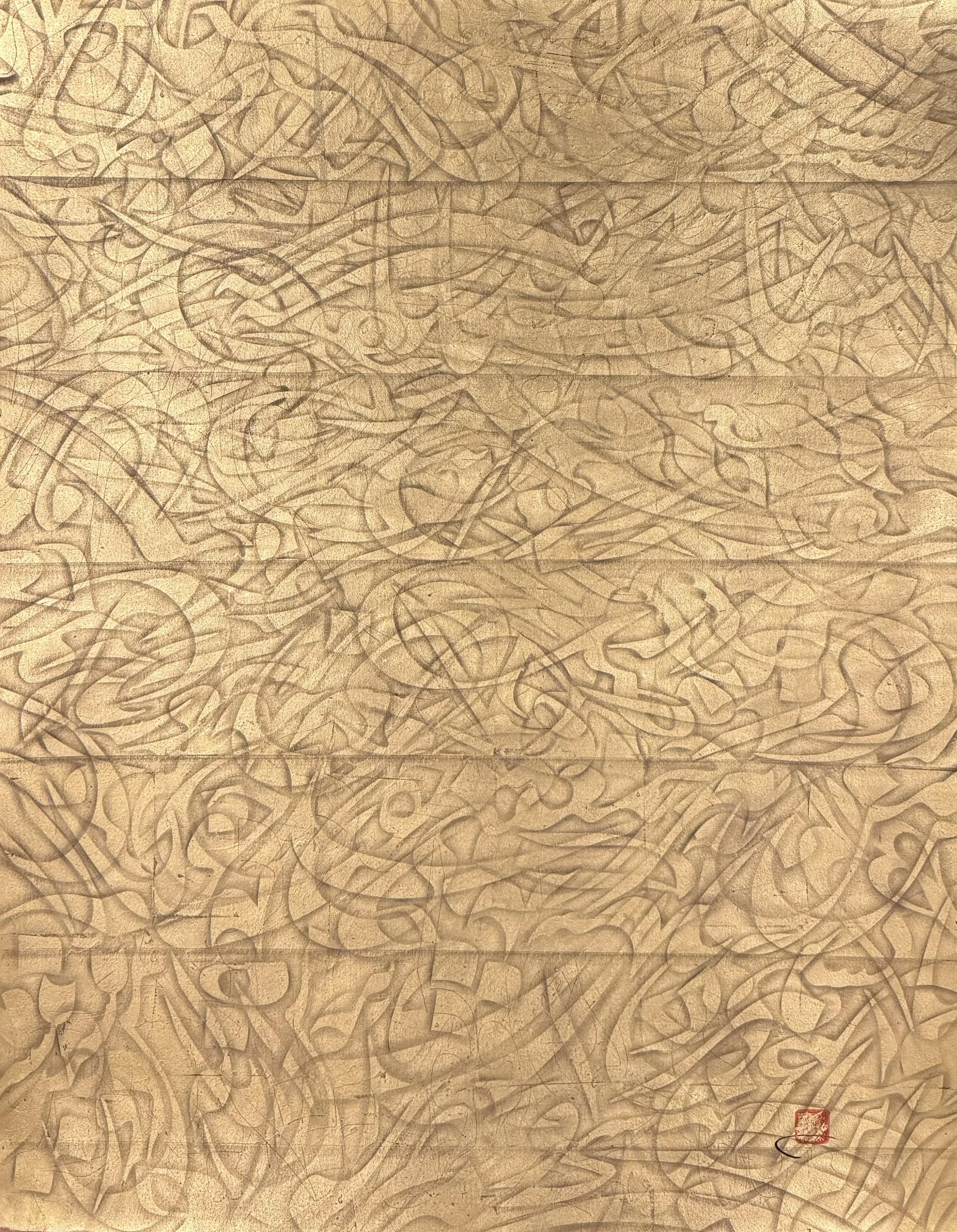 Gold leaf, Japanese ink, acrylic, and watercolor on canvas