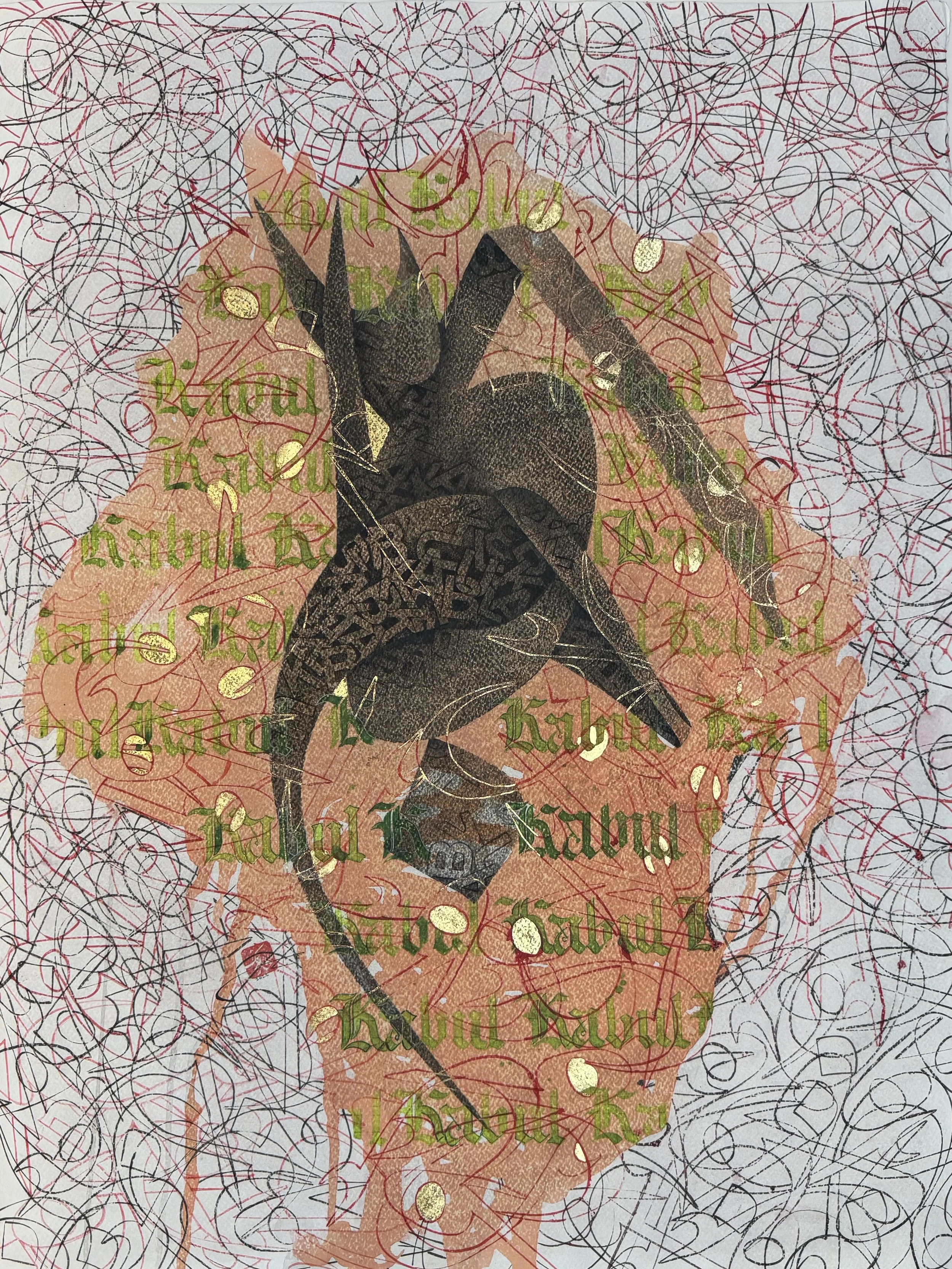 Gold leaf, collage, Japanese ink and acrylic on paper